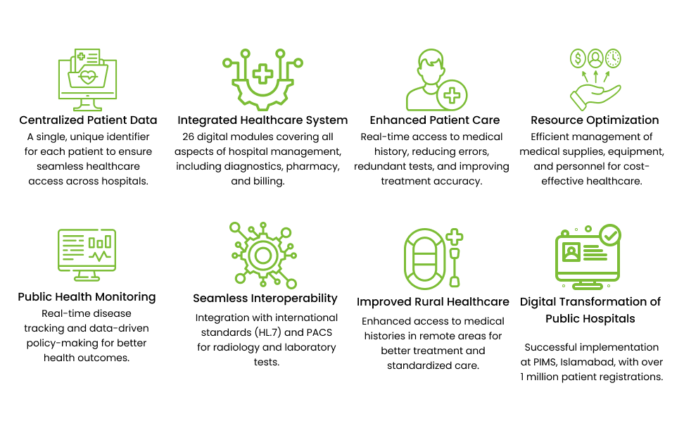 The E-Governance initiative is a major component of the Digital Pakistan Policy, aiming to enhance efficiency in public sector operations. As part of this vision, the "One Patient, One ID" concept was introduced in 2020 to streamline patient services and optimize resource utilization in federally administered hospitals. In Phase I, NITB successfully implemented a model Hospital Management Information System (HMIS) at the Pakistan Institute of Medical Sciences (PIMS), significantly improving service delivery and hospital management.