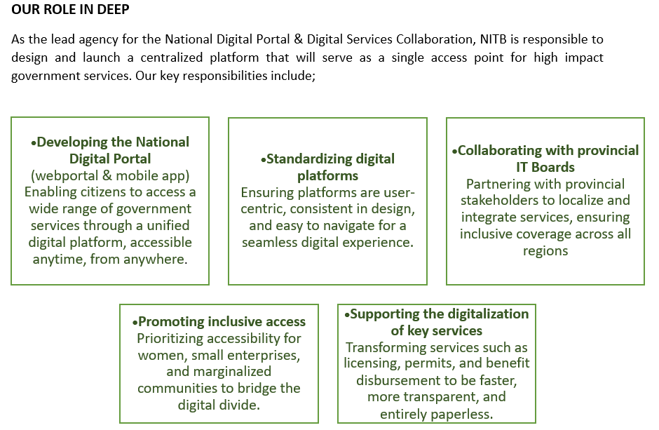 The National Information Technology Board is at the forefront of Pakistan’s digital transformation, leading the implementation of the Digital Economy Enhancement Project (DEEP) — a World Bank-supported initiative. DEEP aims to revolutionize public service delivery by making government services more efficient, transparent, and accessible to citizens and businesses across the nation. As the implementing agency for the National Digital Portal and Digital Services Collaboration Framework, NITB is entrusted with the design, development, and deployment of a centralized platform that will serve as the single gateway to high-impact public services.