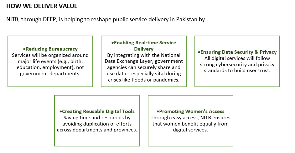 DEEP promotes digital inclusion for all segments of society, regardless of location or socio-economic background, and strengthens cyber resilience through secure infrastructure and global compliance. With a user-centric design, the platform simplifies access to government services, enabling digital payments, document authentication, and real-time updates. NITB’s leadership under DEEP is fostering innovation, public-private collaboration, and citizen engagement, redefining governance for a digitally empowered Pakistan. The initiative supports public sector reform, enhances trust in digital systems, and accelerates the shift towards a smart, connected, and inclusive government.